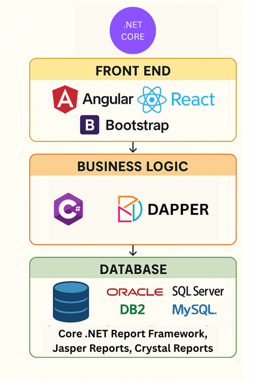 The .NET stack supports a variety of business needs—from online data capture and inquiry screens to complex ETL pipelines, operational reporting, and high-throughput batch processing. We use .NET Core 8, C#, and Dapper for building robust business logic layers, while front-end components are delivered using modern frameworks like Angular, React, and Bootstrap. On the backend, we integrate seamlessly with major databases like SQL Server, Oracle, and DB2.